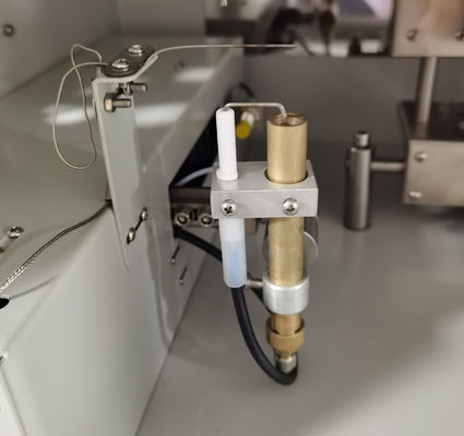 Per un periodo dato, l'estremità del campione orizzontalmente orientato del nastro trasportatore è sottoposta alla fiamma dal bruciatore a gas designato e la durata di eliminazione della fiamma del bruciatore è misurata. Dopo che la fiamma scompare, passaggi di un flusso del gas attraverso il campione per misurare la durata di postluminescenza.