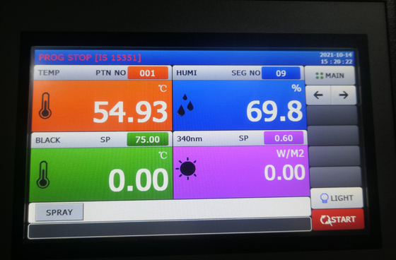 2. Touch screen colorato, indica la condizione della camera in tempo reale, è in grado di preimpostare l'irraggiamento, la temperatura (BPT, BST, camera), l'umidità e tracciarne la curva dinamica.L'operatore seleziona semplicemente il modulo di test richiesto e gli standard di test;Interfaccia utente inglese, il diagramma indica le condizioni della camera, facile da usare;