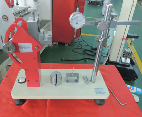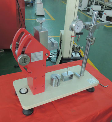 La macchina di cuoio del tester di rigidezza è utilizzata per misurare la rigidezza nella direzione longitudinale degli stinchi d'acciaio usati per il rinforzo della regione della vita di scarpe, lo stinco è premuto alla sua estremità del tallone e l'inclinazione come trave a sbalzo dalle masse ha aggiunto al suo di andata, quindi calcola la rigidità flessionale dello stinco.